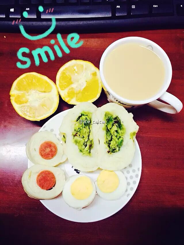 香菇菜包+鸡蛋+香肠卷+糙米浆+橙子